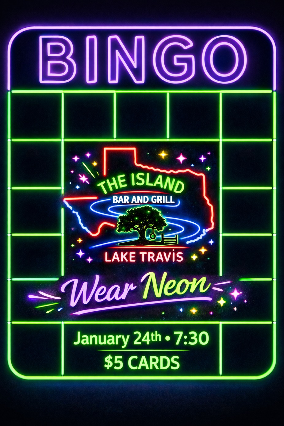 π’π£π΅π΄ NEON BINGO π΄π΅π£π’ Turn the lights down and the energy up β Neon Bingo is taking over The Island with blacklight vibes, bright colors, and nonstop fun. Wear Neon, grab your crew, and get ready to play for just $5 per card. π January 24 β’ β° 7:30 PM