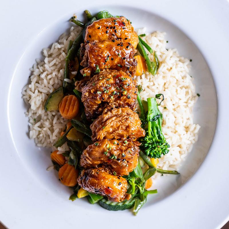 Breaded Shrimp tossed in our Dynamite Sauce, Green Onions, Sesame Seeds served with rice and your choice of one side.