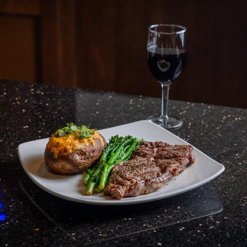12 oz Ribeye Steak perfectly seasoned and Grilled to perfection served with homemade garlic herb butter with your choice of two sides.