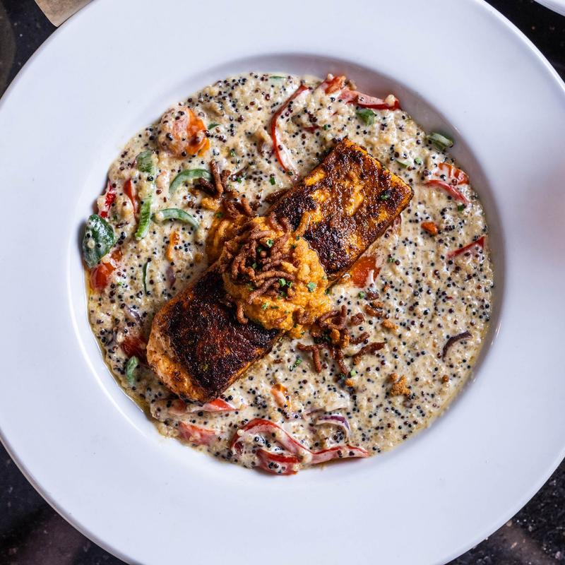 Seared Salmon over creamy quinoa risotto with sauted bell pepper, onion, and tomato topped with romesco sauce and a hush puppy crumble