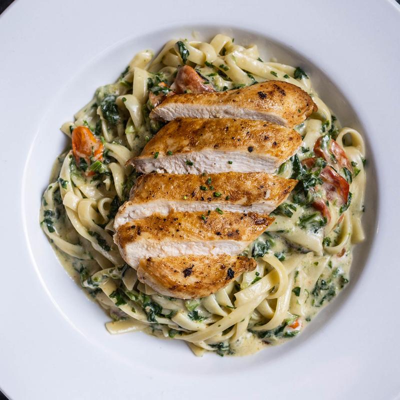 Grilled Chicken served over Pasta with Cherry Tomatoes and Baby Spinach in a Tuscan Cream Sauce